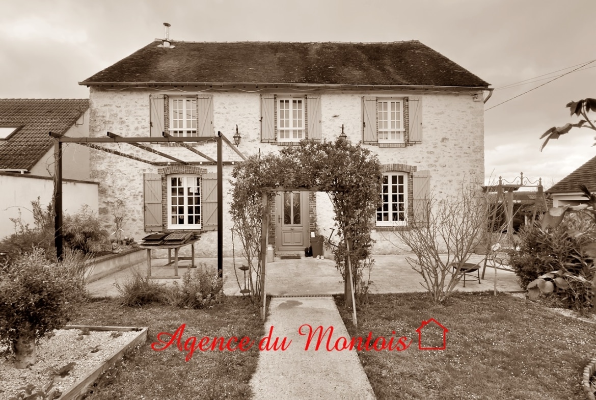 77 - Région LONGUEVILLE, à 2 mn de la gare et des principaux commerces, dans village aux alentours champêtres, sur 826 m² de jardin d'agrément clos, charmante MAISON BRIARDE en pierres apparentes, bien entretenue, spacieuse, à la décoration campagnarde :